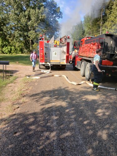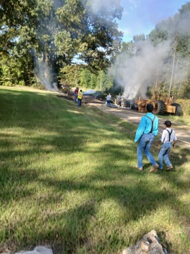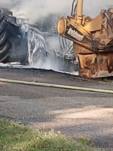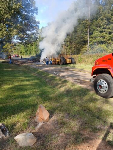 COLUMBUS – A Saturday afternoon fire on Silver Road off Highway 73 heavily damaged an articulated tractor towing a pull-behind scraper. Volunteer fire departments and personnel responded from Columbus, Saratoga, and Yancey. Photos courtesy of Jerry Hardeman-Johnson.