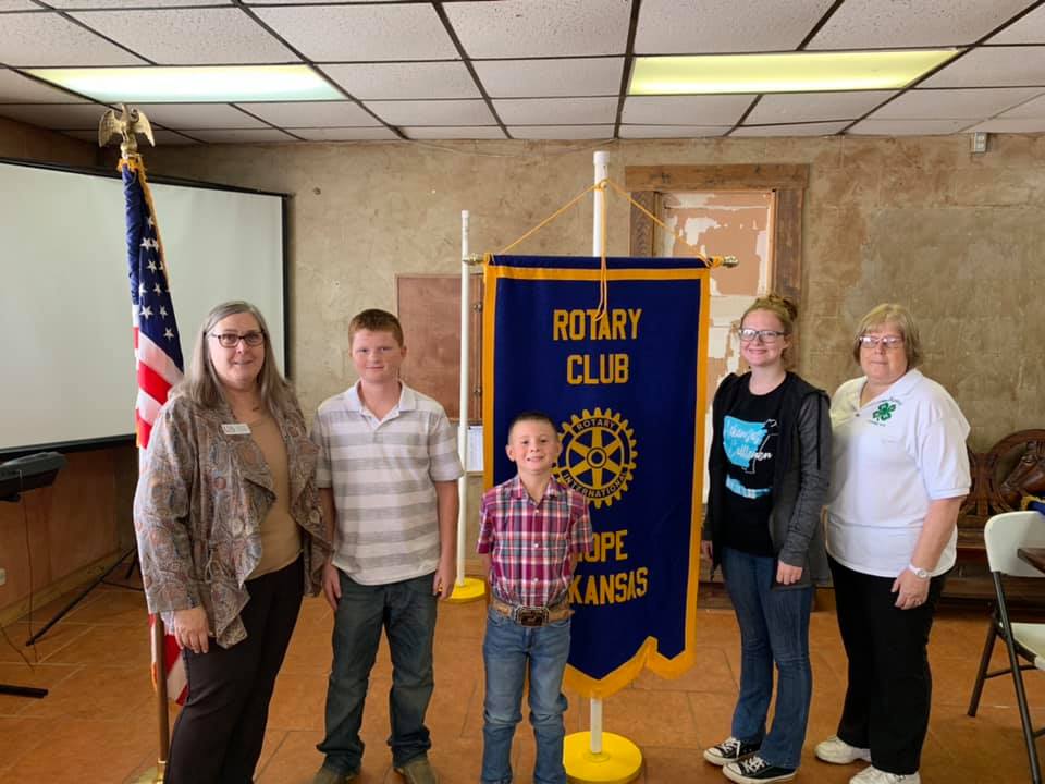 Fair Season is upon us, and the Hope Rotary Club heard from a few of the Hempstead County Fair Participants on Thursday August 22nd.. Harlie Lockhart, Lane Lockhart, and Huck Plyler told about their show projects, explained the daily work that goes into showing animals, and then invited the Rotarians to their show and the Premium Sale August 30. Come to the fair grounds to support the future of our community. Thanks to Rotarians Cindy Lance andTheresa S. Terrie James for sponsoring the program!