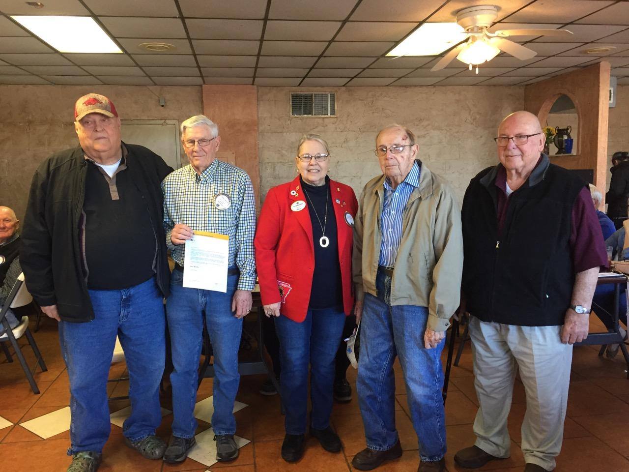The Hope Lions Club ended 2019 by honored three long-time members.  Monarch Chevrons are awarded to Lions beginning in their tenth year of service and every five years thereafter.  Claudia Griffin presented a 30 year award to James Griffin (yes, her husband!) and J.W. Rowe.  Bill Byrd was honored with a 45 year award, and Harold Freeman received a 50 year award.  Our congratulations go to these outstanding Lions for their many years of service to Hope and to Lionism!