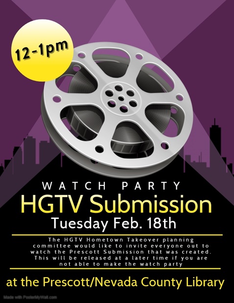 PRESCOTT – A watch party for the video shot recently for HGTV’s Hometown Takeover will be shown at the Nevada County Library.