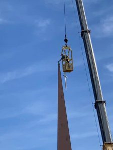 Among all the uncertainty in our world these days, the best show in Hope on Thursday morning was at First United Methodist Church. Hostetler Roofing had a large crane at the church on highway 29 south to remove the church’s steeple. Plans are to repaint the steeple and fix some possible leaks. We have to admit, with all the chaos in the world these days, there is something downright comforting in watching a skilled crew work on a church steeple! Thanks to Dixie Coffee for the photos!