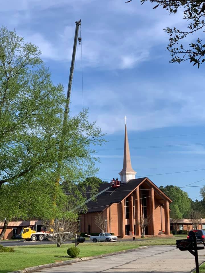 Among all the uncertainty in our world these days, the best show in Hope on Thursday morning was at First United Methodist Church. Hostetler Roofing had a large crane at the church on highway 29 south to remove the church’s steeple. Plans are to repaint the steeple and fix some possible leaks. We have to admit, with all the chaos in the world these days, there is something downright comforting in watching a skilled crew work on a church steeple! Thanks to Dixie Coffee for the photos!