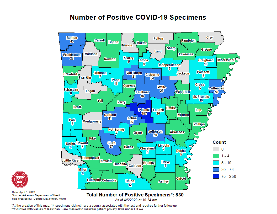 As of early evening Sunday there were 853 confirmed cases of COVID-19 in the state with 16 deaths. The map shown here dates from earlier in the date but reflects some specific numbers of some of the counties around us. Hempstead and Nevada are still showing 1 to 4 cases each.