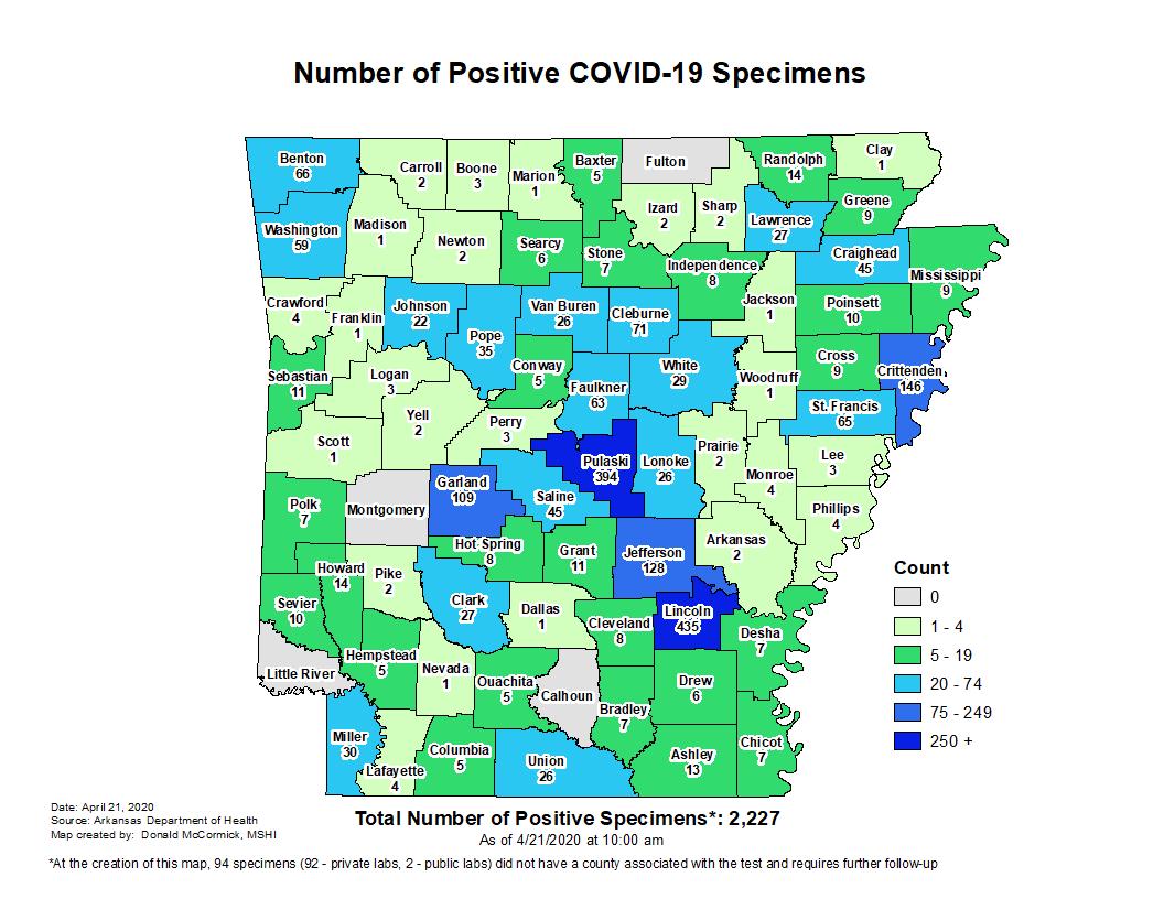 Hempstead County is showing 5 confirmed cases and 2 recoveries. Nevada County is showing 1 confirmed case and 1 recover. Howard County is reportin 14 confirmed cases, 7 recoveries, and 1 death. Lafayette County is reporting 4 confirmed cases and 3 recoveries.