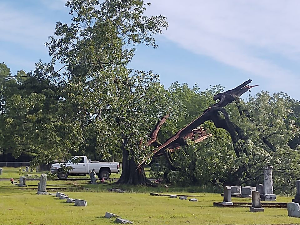 City crews were at Rose Hill Cemetery on North Hazel in Hope Wednesday morning to deal with part of a giant oak which split during Tuesday’s storms. Part of the tree remained standing but more than half of the tree was on the ground near a shed in the center of the cemetery. It was not apparent if any headstones were damaged by the tree.