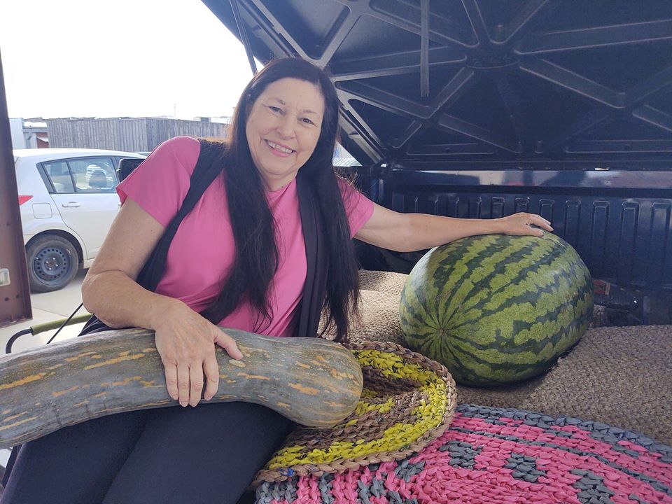 Giant watermelons grown by the Bright family are hallmark of Hope and at Tuesday’s Hope Farmers Market Pat Bright Rhoads displayed the first one of the season. Rhoads, who owns BeDazzled at 104 South Main in downtown Hope was at the market selling face masks but also showed off a 139 pound melon grown by her brother Lloyd on the Bright Farm near Rocky Mound. She also had a giant zucchini grown by her brother. As soon as we hear about where a giant Bright watermelon is placed on display we’ll let you know where it is so you can bring visitors to go see it. With all that’s topsy-turvy in the world this year, it’s good to know Lloyd Bright is still growing giant Hope watermelons!