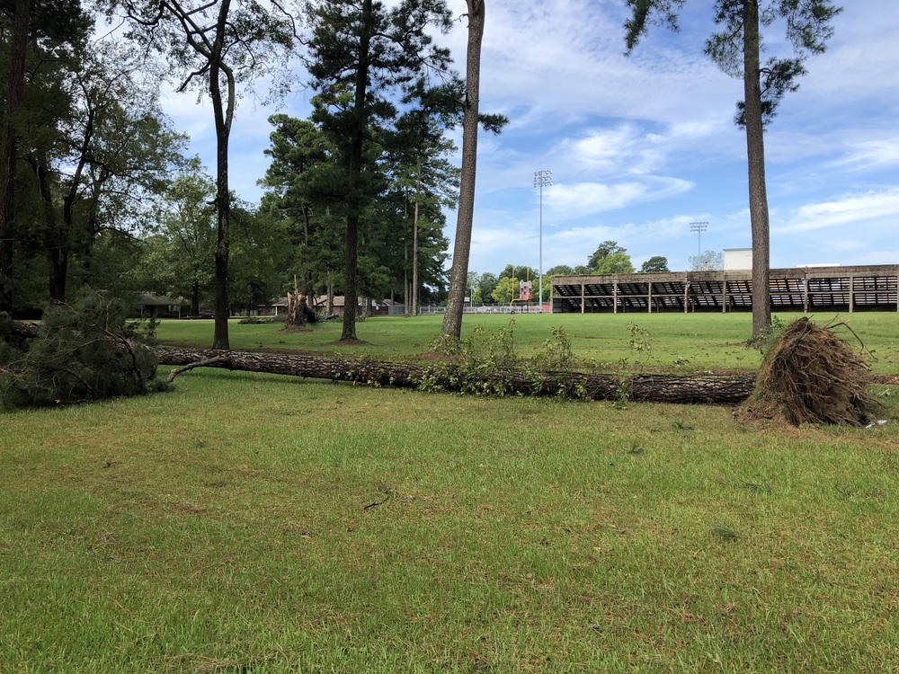 The tree damage on high school property behind Hammons Stadium between 16th and 18th streets was limited to two pine trees, one apparently snapped during wind gusts and the other which was uprooted from saturated soil. No collateral damage resulted in either case.