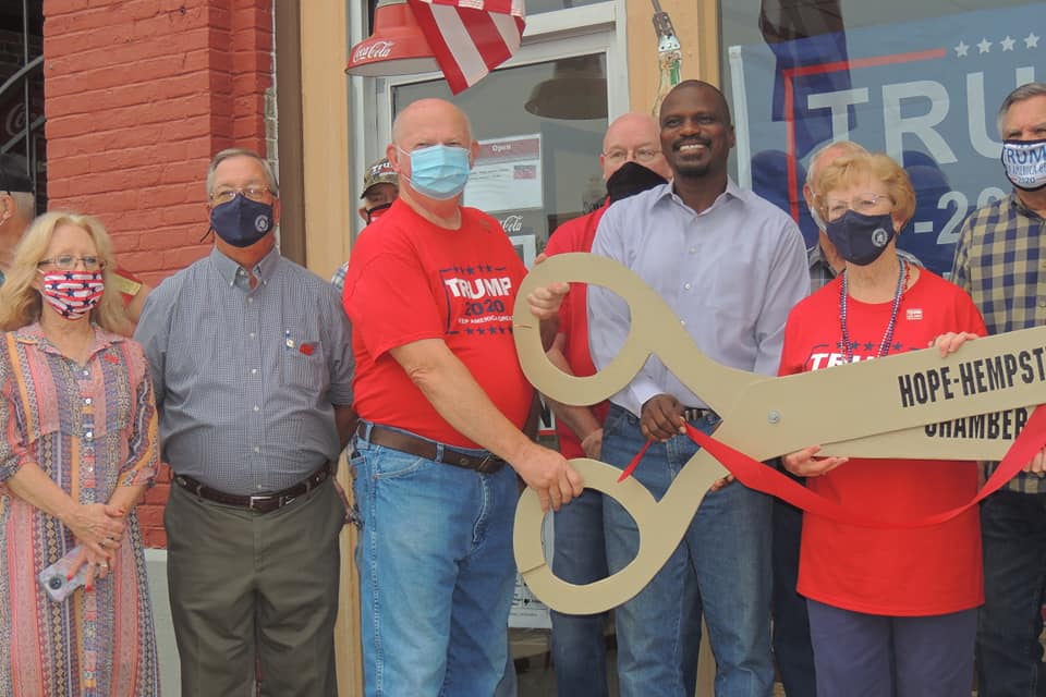 The Hope/Hempstead County Chamber of Commerce held a ribbon-cutting for the Hempstead County Republican Headquarters at 105 South Main on Tuesday. The headquarters had quite a bit of traffic as many stopped by to enjoy refreshments and to pick up campaign items. The headquarters will be open weekdays from 10am until 6pm and Saturdays from 10am until noon. The headquarters has signs, masks, hats, t-shirts, bumper stickers, informational pamphlets, and Republican jewlery. The public is welcome.