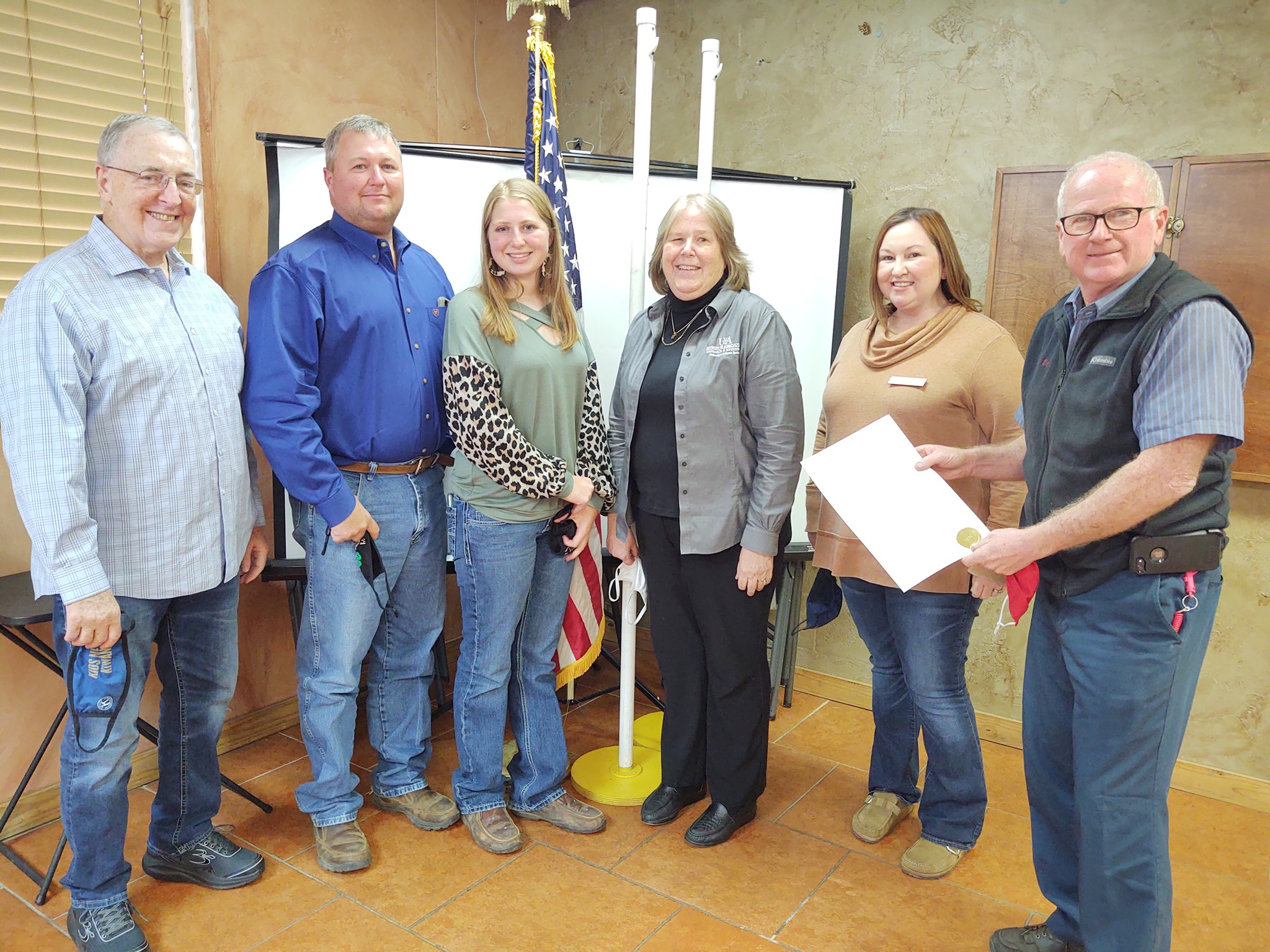 The special programs wrapped up on November 24th with the annual “Farm City Week” program. The observance was smaller this year as the club didn’t invite farmers as guests. The program was brought by the Cooperative Extension Service and the Farm Family of the Year. Again, Vice-Mayor Still offered a proclamation on behalf of the city. Pictured are program organizer Bob Willis, Chris Sweat and daughter Sara who are part of the Farm Family of the Year, Terrie James and Kimberly Rowe of the Cooperative Extension Service, and Vice-Mayor Still.