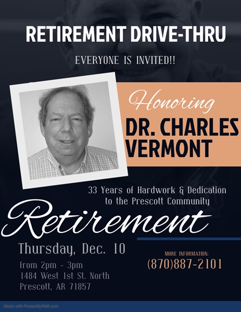 Featured Nevada County News News Drive through retirement set for Dr. Vermont submitted December 1, 2020 PRESCOTT – After 33 years, Dr. Charles Vermont is retiring. A drive through retirement celebration is scheduled for Dec. 10, from 2-3 p.m. at 1484 West First Street North. The public is invited to this unusual retirement gathering.