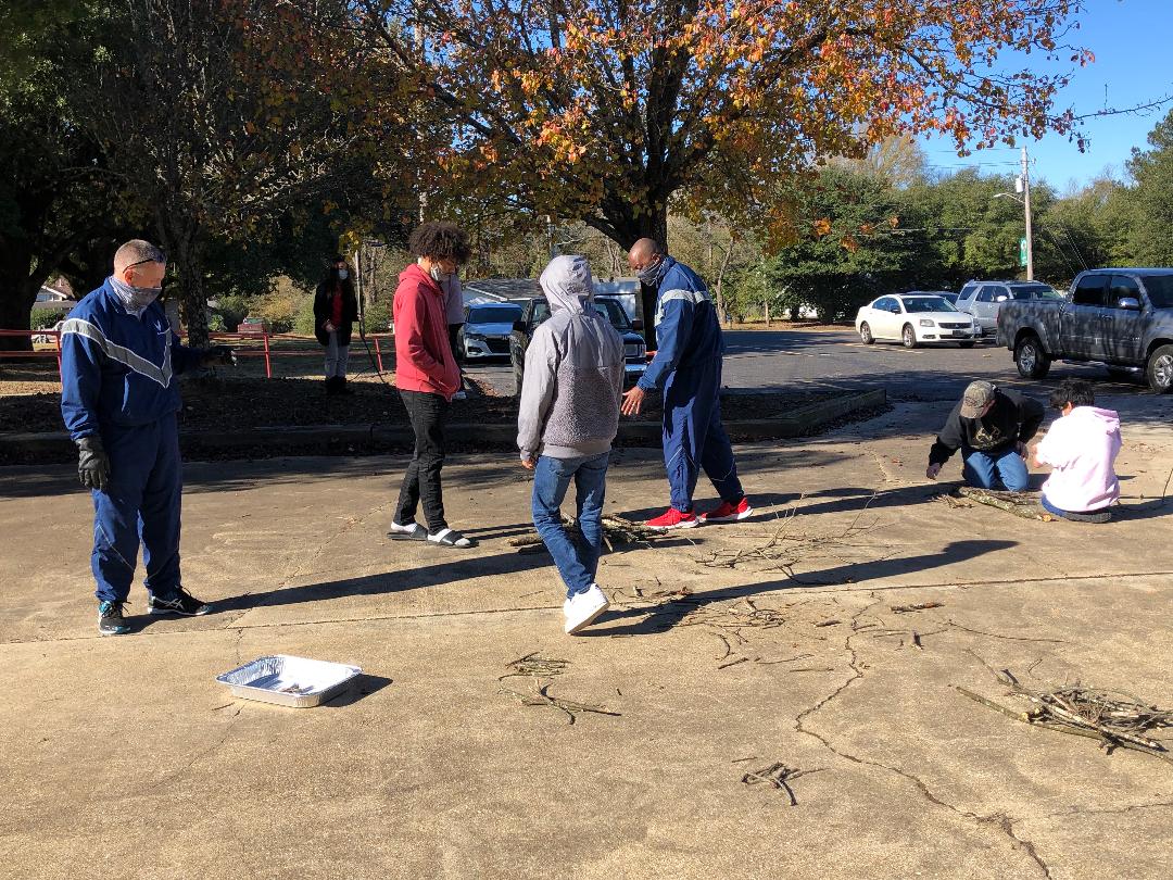 Senior Aerospace Instructor Lieutenant Colonel (Ret.) Mark Hart, left in blue, and Aerospace Instructor Master Sergeant Jeremy Grice, right in blue, put Hope High School Air Force Junior Reserve Officer Training Corps cadets through basic survival skills training in a recent outdoor exercise on how to build a fire using the “flint and steel” method. – Ken McLemore/Hope Public Schools