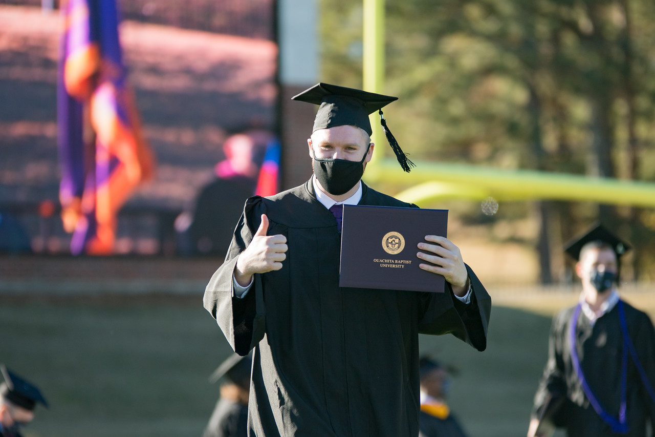 ARKADELPHIA – Ouachita Baptist University celebrated 309 graduates from the classes of 2019 and 2020 during its 133nd commencement ceremony in December. The ceremony, which was rescheduled from its original date in May due to COVID-19, was held outdoors at Cliff Harris Stadium on Ouachita’s campus and followed Arkansas Department of Health protocols for guest and graduate safety.
