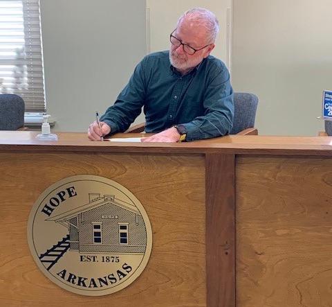 Hope Mayor Don Still signs a City of Hope proclamation declaring January, 2021, to be School Board Recognition Month in Hope and saluting Hope Public Schools Board members Viney Johnson, Margaret Moss, Jimmy Courtney, Linda Haynes, Kathryn Dickinson, Alvis Hamilton, and David “Bubba” Powers for their role in the community and as advocates for public education. – City of Hope for Hope Public Schools