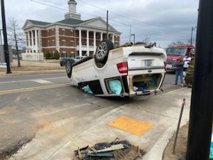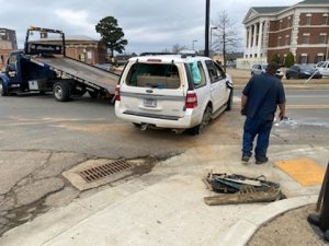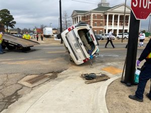 Authorities were on the scene of an accident at Third and Walnut in Downtown Hope shortly after noon. Apparently a Ford Expedition was traveling on Third Street and was struck by a black Cadillac that entered Third from Walnut. The teen-aged driver of the Ford was taken to the Emergency Room via private vehicle and the other drive was transported to Wadley in Hope via ambulance.