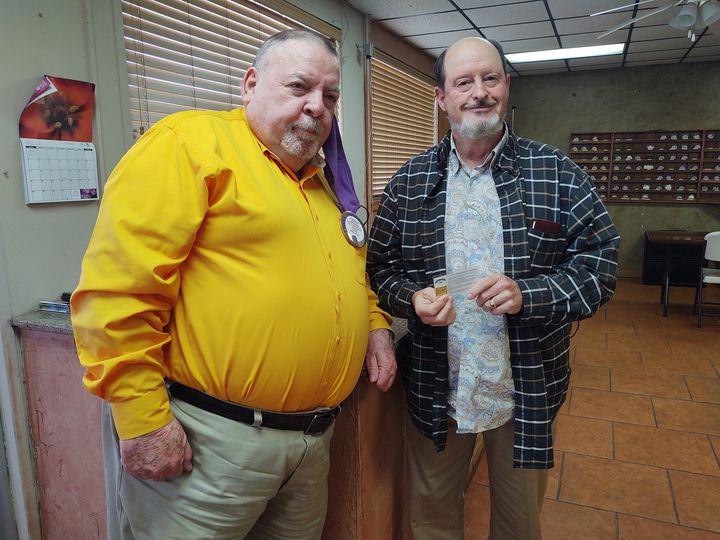 Lion John Collier presented Lion Dave Phillips with a “gold” award at Monday’s meeting.  The award was for recruiting a member to the club who served as an active member for over a year.  Both Collier and Phillips are long time members of the club.