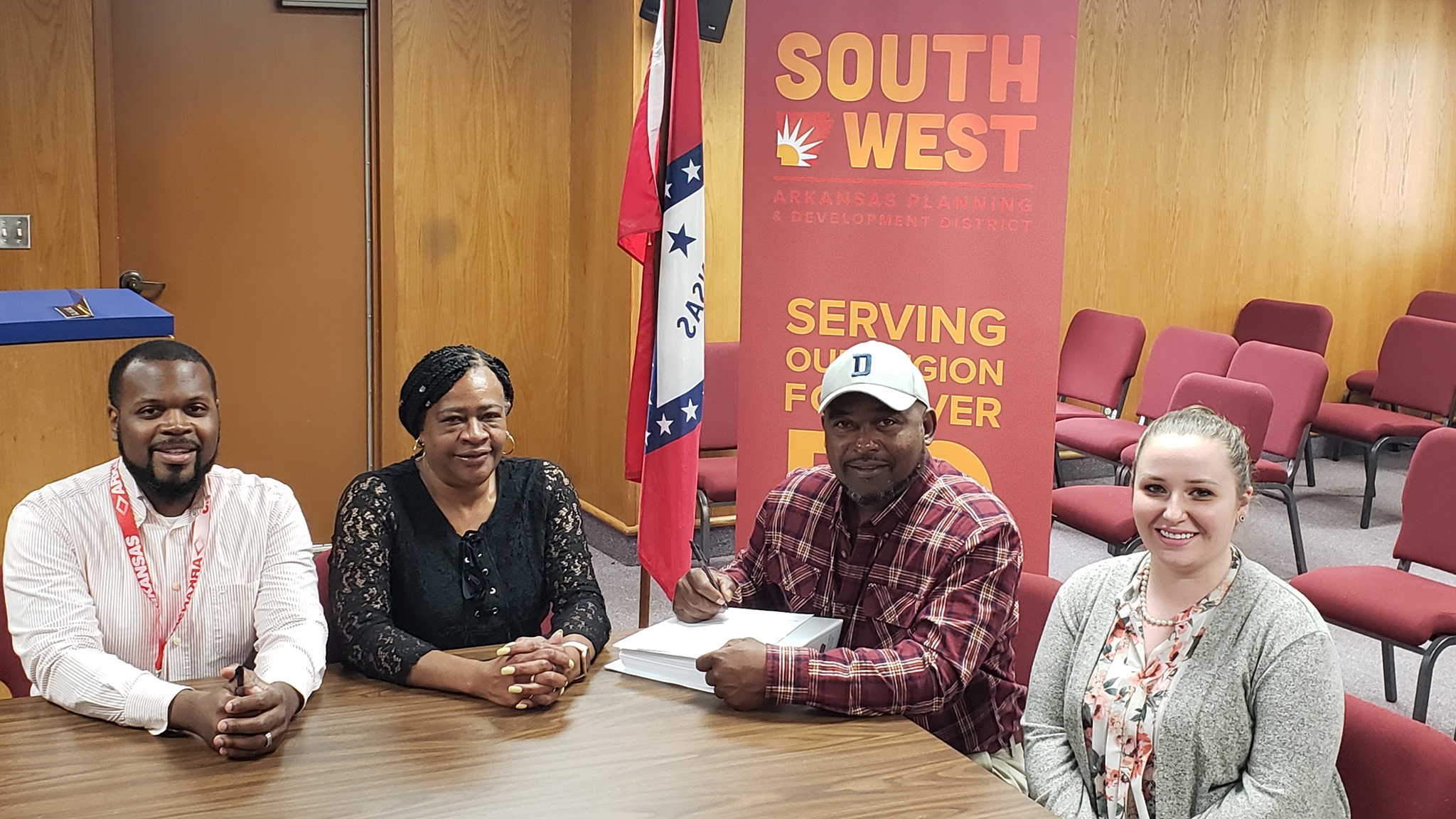 “The Southwest Arkansas Planning & Development District is happy to announce that the City of Rosston in Nevada County has been awarded $75,000 that will go towards the purchase of a new Fire Truck. Left to right in the Grant Signing picture is Asher Gaddy, AEDC Grants Manager, Ms. Emily Kirby, Mayor Samuel Quarles, and Florence Nunn CEDC Coordinator for Southwest Planning.”
