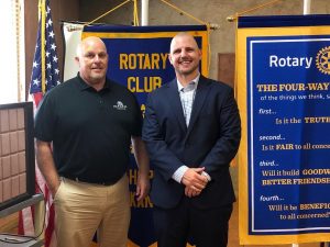 Hope Public Schools Superintendent Dr. Jonathan Crossley, right, offered his vision for the HPS as the newly-installed superintendent as guest speaker for the Hope Rotary Club. Rotarian Rodney Orr, left, sponsored the program. – Ken McLemore/Hope Public Schools