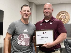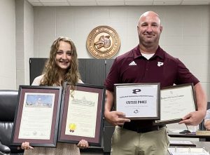 PRESCOTT – Thursday evening the Prescott School Board and Superintendent Robert Poole recognized Coach Brian Glass and Caytlee Poole as outstanding Curley Wolves for recently being recognized at the state and national level.