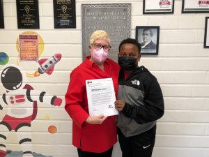 Hope Academy of Public Service Principal Dr. Carol Ann Duke, left, and student JyKhaden Muldrow display the letter from U.S. News and World Report magazine notifying HAPS of its ranking as a U.S. News Best Middle School in Arkansas. – Ken McLemore/Hope Public Schools