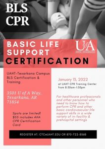 The University of Arkansas Hope-Texarkana Cardiac Training Center will offer a Basic Life Support Certification and Training course on January 13 from 8:30 a.m. to 1:30 p.m. at the Texarkana campus. The course is open to the public and is designed for anyone from healthcare professionals to other personnel who need to obtain CPR certification.