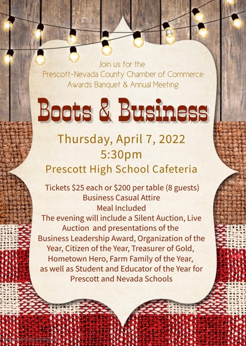 PRESCOTT – The Prescott Nevada County Chamber of Commerce has rescheduled the 2021 Chamber Banquet \ Annual Meeting for Thursday, April 7, 2022. The event will be held at the Prescott High School Cafeteria, starting […]