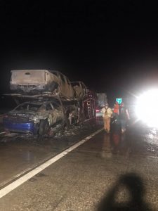 The Fulton VFD along with the Guernsey VFD were called to vehicle on fire at the Exit 18 off ramp westbound. Upon arrival firemen found a Semi hauling cars and pickups. The car trailer with vehicles was on fire. Both departments were able to put the fire out. Thanks to ASP, HCSO, ArDOT, and Pafford EMS for their help.