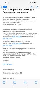 If you receive a call or email from someone saying that you forgot to pay your water and light bill, be cautious. Hope Water & Light employees are not making telephone calls or sending emails to customers requesting payments for utility bills. The email or caller tells you that our records indicate that we haven’t received payment for the previous month’s bill. They even give you a disconnection date in case it is not paid and a telephone number to call. Hope Water & Light employees are not making telephone calls or sending emails to our customers and making such a request. Hope Water & Light’s normal office hours are from 8:00 a.m. – 5:00 p.m. Monday through Friday. The only telephone numbers we provide for payments are 870-777-3000 or 844-201-7202. If it doesn’t seem right, chances are it isn’t right. You should always verify any information by contacting the customer service department at Hope Water & Light at 870-777-3000.