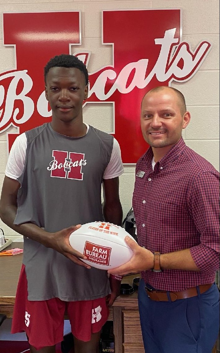 This week’s Spring Hill High School Football “Farm Bureau Player of the Week” is # 5, Dalton Glover. Dalton is a SR Linebacker, that had 7 tackles, 1 sack, and ran for 1 touchdown in the Bear’s win against Dermott ! Presenting his award is Trent Wheelington with Farm Bureau Insurance. Congratulations Dalton !