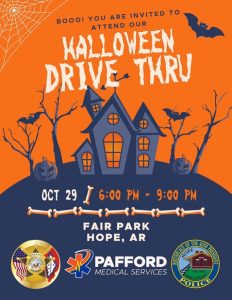 HOPE – Due to inclement weather, the Halloween Drive-Thru will be postponed until Monday, October 31st, 2022, from 6:00 PM – 9:00 PM