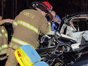 At least two people were injured in a three vehicle accident on US 67 west in Hope in front of the sale barn around 5:30pm Tuesday. Hope Firemen had to use extrication tools to free one driver who appeared alert during the rescue. Personnel were on hand from the Hope Police, Hope Fire Department, Hempstead County Sheriff’s Department, Southeast VFD, Arkansas State Police, and Pafford.