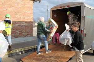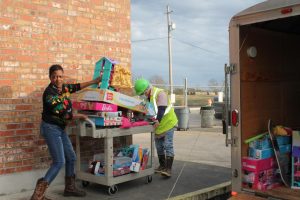 Tyson Foods of Hope are pictured with a mountain of donated toys, clothes, blankets,