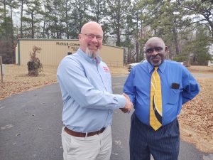 McNab Mayor James T. Conway is shown shaking hands with Jay Click of Southwest Arkansas Planning and. Development District to celebrate the town’s  award of a grant through the Arkansas Department of Parks, Heritage, and Tourism.  The grant will fund the reconstruction of a quarter-mile, 6 foot wide walking track at McNab Park.  The original track was built in 2009 and has deteriorated to where parts of it are unusable.  SWAPDD will administrator the grant which is for up to $99,000.  SWAPDD will essentially pay the bills as they come in on the project.