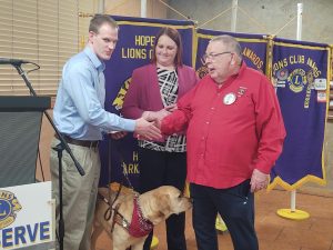 The Hope Lions Club heard a program from Eric Yarberry and Heather Miller of World Services for the Blind in Little Rock. Yarberry is President and CEO and Miller serves as Director of Education and Training. Lions John Collier is shown presenting Yarberry with a check from the Hope Lions Club. The club has long supported Wolrd Services.