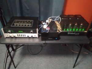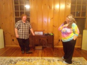 Thursday evening Klipsch Heritage Museum Association had it’s Visitor’s Center open for a free event of listening to music in the 50s and 70s listening room, a couple of rooms upstairs and a home theater room open for listening to Klipsch speakers. The sound was amazing in its clarity. People were there from as far away as Pennsylvania, Colorado and Michigan. A variety of music was listened including Rosanna by Toto, Doc Watson, classical music. Pictured are Denise Cooper – Secretary of the KHMA Board of the Trustees, Colter Hess – Member of KHMA from Colorado and Mike Dyer – Klipsch Heritage Brand Ambassador who lives in Michigan. Next to Cooper and Hess are Klipschorn speakers up for auction.