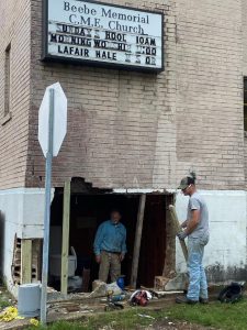 The Historic Beebe Memorial C.M.E. Church received some much needed repairs recently Wyndell Bailey and Matt Brady patched a hote on the northeast corner of the church caused by a vehicular accident last fall. The accident left a big hole; however, the building was still able to be used.