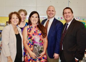 Appearing in the photo, from left to right: Stacy Smith, Carla Narlesky (Interim Principal), Kristi Robbins, Supt Dr. Crossley, and Tim Cain.