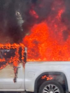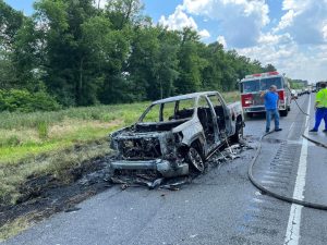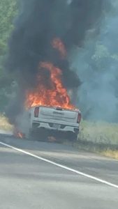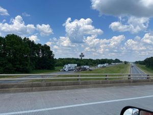 PRESCOTT – Traffic was snarled for miles on Interstate 30 around the 43 and 44 mile markers, in both the eastbound  and westbound lanes, following two seperate incidents around 2:30 this Wednesday afternoon. In one incident, a GMC pickup was totally destroyed around the 43 mile marker. (That is shown in the first three images below.) Around the 44 mile marker near Prescott a chain-reaction crash occurred. (As seen from an overpass in the 4th photo.) This is a developing story…