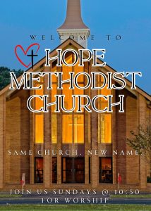 editor’s note…the Methodist Church on Highway 29 south has a new name and sent us this news release…we are happy to share it and wish the best for the Hope Methodist Church!