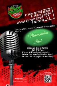 The Hope-Hempstead County Chamber of Commerce is excited to announce Watermelon Idol will be held Friday, August 11th, 5:00pm at the 47th Annual Hope Watermelon Festival. There will be trophies and cash prizes for 1st through 3rd places. Our host for this event will be the 2022 Watermelon Idol Winner, Arnetta Bradford. The winner from this preliminary event will perform Saturday, August 12th at Legion Field before The Marshall Tucker Band. Please use the QR Code on the attached flyer for rules and registration or you can visit https://docs.google.com/forms/d/e/1FAIpQLSd9CiDqQI73Elo4HqyJs1G5HCJQ2XD9cYi-Kwjdo2icxQO49Q/viewform