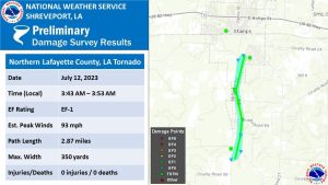STAMPS – The torrential rain event that affected parts of south Hempstead County had a severe weather component for Lafayette County. The National Weather Service in Shreveport assisted by the Lafayette County Office of Emergency Management survey evidence of a tornado touchdown south of Stamps.