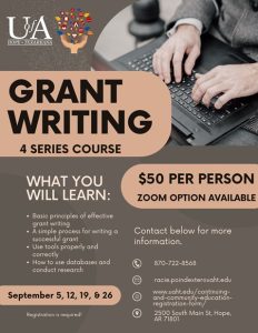 HOPE/TEXARKANA – The University of Arkansas Hope-Texarkana will hold a four-series grant writing course on Tuesdays, September 5, 12, 19, and 26, from 5:30 to 7:30 p.m. at the UA Hope campus. A Zoom option is available.