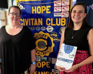 The Hope Civitan Club was recently entertained and inspired by Jennifer Gentry of Hope, who has authored and illustrated her first book for children and their parents. Shoes On was inspired by the author’s own “mom” experience in getting a child ready to go out. An occupational therapy assistant who works in Hope Public Schools, Gentry also presented an impressive theory of how to help children become life-long readers. Shoes On is available at jennifergentrybooks.com and as an ebook from Amazon. Gentry is pictured with Amber Mackey, immediate past president of the Hope Civitan Club, which meets the second and fourth Tuesday each month at 6 p.m. at Dos Loco Gringos Mexican Restaurant.
