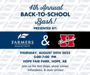 Farmers Bank & Trust and the Hope Public Schools will present the 4th annual “Back to School Bash” August 24th from 5pm to 7pm at Fair Park. There will be hot dogs, sno cones, inflatables and door prizes All students are invited