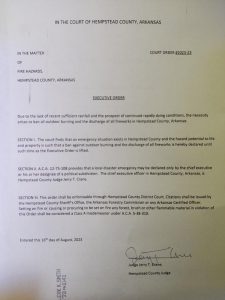 Hempstead County Judge Jerry Crane has issued an Executive Order against any outside burning due to dry conditions.
