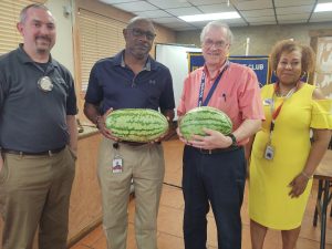 The Hope Kiwanis Club welcomed Mo-Ark District Governor Roy Ockert and his wife Pat from Jonesboro on Tuesday (8-22).  The District Governor gave some information about Kiwanis projects on the international level as well as from local clubs.  He shared some statistics and detailed some new clubs that have formed.  Kiwanis President (and Lt. Governor) Charlotte Bradley presented the Ockerts with several gifts including some Hope watermelons.