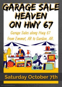 With this in mind, those with plenty of excess items to sell should be getting ready for the Annual Garage Sale Heaven on Hwy. 67 on Oct. 7. The sales will be along Hwy. 67 and normally stretch from Prescott to Emmet, though some also head toward Gurdon.