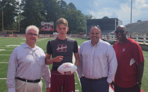 Congratulations to this week’s Hope High School “Farm Bureau Player of the Week”, # 1, Tyler Patterson. Tyler is a Sr Quarterback that had 18 out of 23 completions, 219 passing yards and four passing touchdowns. He also had 5 carries and 1 rushing TD in the Bobcats Homecoming win over DeQueen Friday night. Presenting his award is Farm Bureau Ins agents, Reed Camp and Darrell Davis, along with head coach Phillip Turner. Great job Tyler