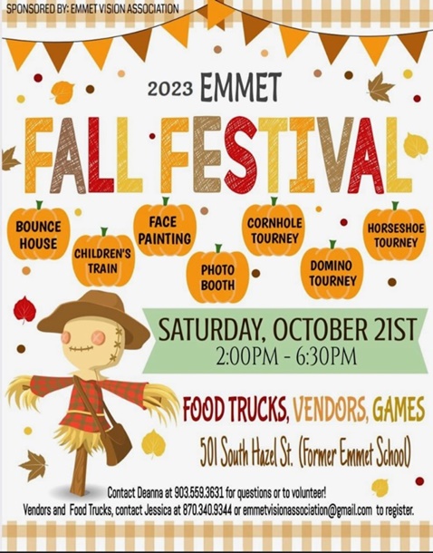 EMMET – Emmet’s annual Fall Festival will be from 2-6:30 p.m. Saturday, Oct. 21 at the former Emmet school. There will be bounce houses, a […]