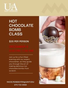 HOPE – Winter is here, and what better way to warm up than with a delicious and decadent hot chocolate bomb? Join us for a DIY workshop at the University of Hope-Texarkana on December 5 from 5:30 to 7:30 p.m., where you’ll learn how to make your own hot chocolate bombs from scratch. You’ll leave with the knowledge and skills to create your own delicious treats, perfect for cozy nights in or as a unique homemade gift for loved ones. Don’t miss out on this fun and festive event.