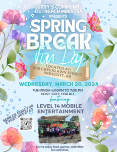 Announcements Spring Break bash at Curry’s submitted March 12, 2024 PRESCOTT – from 4-7 p.m. Wednesday, March 20, Curry’s Community Outreach will be hosting a Spring Break fun day. There will be the Level 14 mobile entertainment truck along with food, game and plenty of fun. There is no charge for the event.